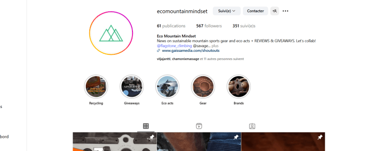 Eco Mountain Mindset @ecomountainmindset is Gaissa Media’s shoutout page for sustainable mountain sport brands and gear. It serves as a space to spread information about sustainable climbing, mountaineering and skiing gear, events and innovations. @ecomountainmindset has been growing organically at a steady pace and the page currently has hudreads of real followers (not bots) – including known professionals and brands such as Daila Ojeda and La Sportiva Finland,
