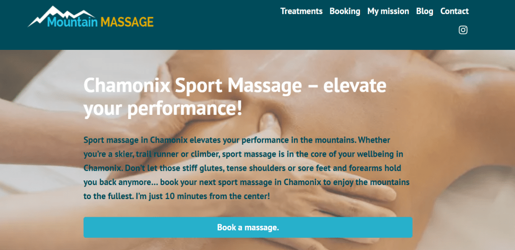 Currently Mountain Massage Chamonix’s new website is active, in good use and ranked in top 3 for the relevant keywords on Google search. Co-opration with Mountain Massage still continues in the form of content creation for the Mountain Massage Chamonix blog.